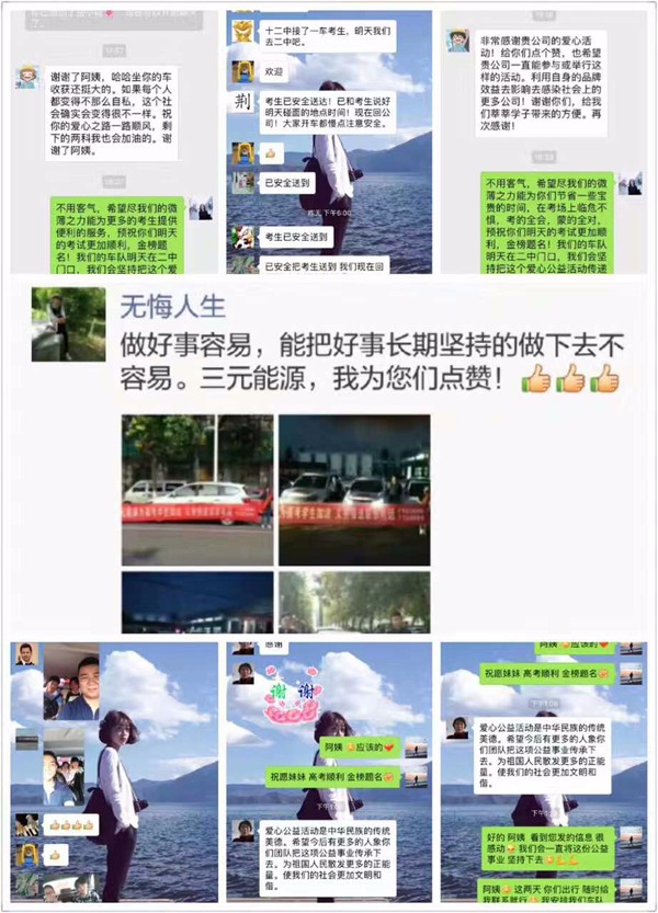 三元人懷揣著激動(dòng)而又心安的心情,此屆愛(ài)心***公益活動(dòng)***結(jié)束在此,也感謝所有三元能源的家人們,謝謝你們這兩天辛勤地的付出,同時(shí)讓每一位三元人也切身體會(huì)到的更多的是滿(mǎn)滿(mǎn)的感動(dòng)和愛(ài)。兩天雖短,卻讓我們收獲頗豐,更得到了社會(huì)各界的支持和贊譽(yù),尤其是來(lái)自考生和家長(zhǎng)發(fā)自肺腑的感謝和真摯的祝福期間所有感動(dòng)的瞬間,大愛(ài)的流露太多太多!期間我們遇到了一位家長(zhǎng),她的一雙兒女,兩年都是分別被我們車(chē)隊(duì)接送,今年是她的女兒;我們一大早六點(diǎn)就起來(lái)在新鄉(xiāng)市公交站牌、小區(qū)門(mén)口等候接送,家長(zhǎng)知道我們起得早,第二天考試直接給我們準(zhǔn)備了一大袋的鹵雞蛋,說(shuō)句心里話(huà),這一次是我們吃過(guò)***好吃的鹵蛋…等等…太多太多的感人事跡和關(guān)于愛(ài)和緣分的故事很慶幸擁有三元能源這個(gè)大家庭,也很慶幸每一位三元人都能真正靜下心來(lái)去踐行這份公益事業(yè),同時(shí)我們?nèi)茉垂靖鼤?huì)堅(jiān)定不移地把這份愛(ài)心公益活動(dòng)傳承下去***后,祝愿所有2017年的高考生們:愿你們合上筆蓋的那一刻,有武士將刀收回劍鞘般的驕傲未來(lái),我們一起加油!